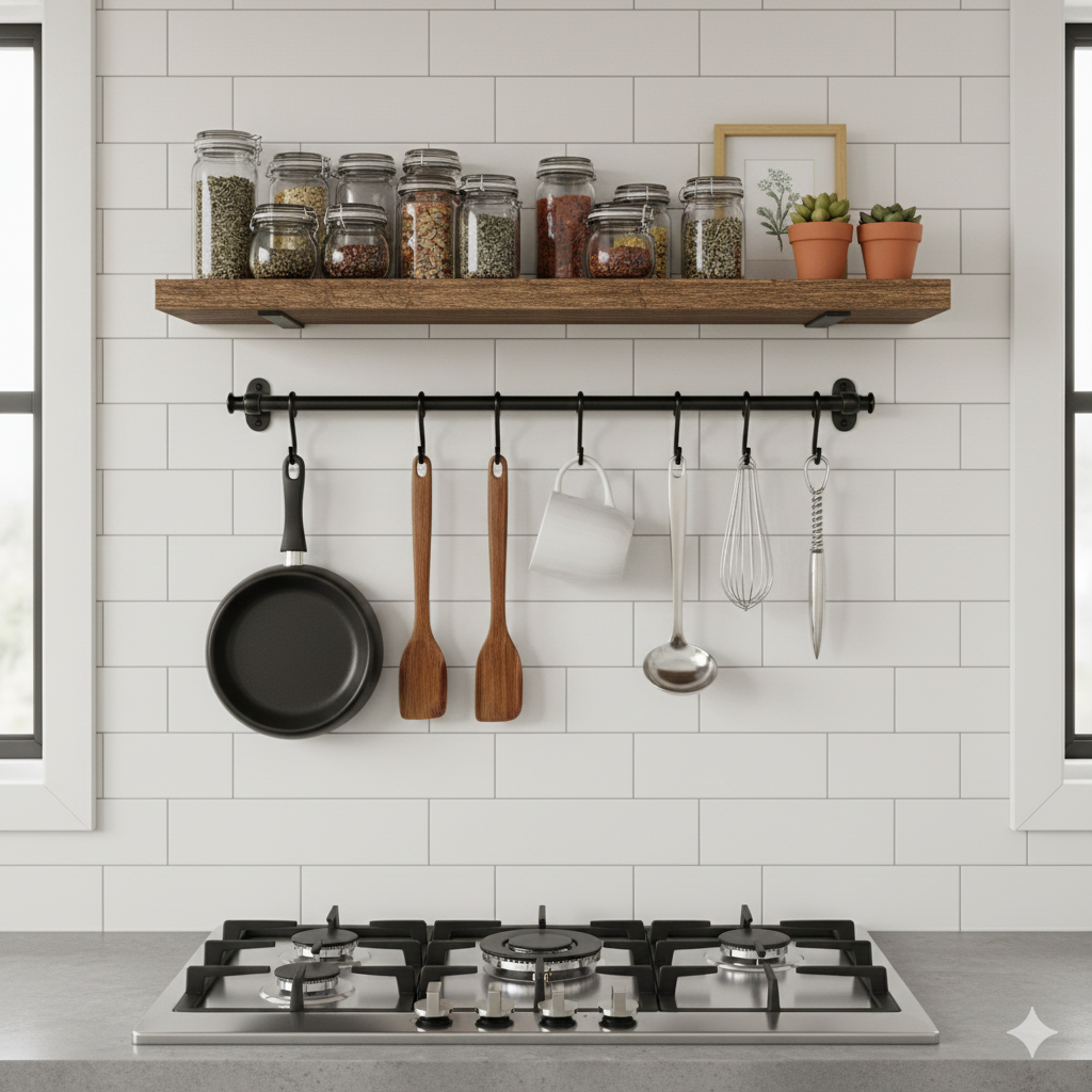 Rak ini menciptakan kesan lega dan rapi meski dapur kecil.