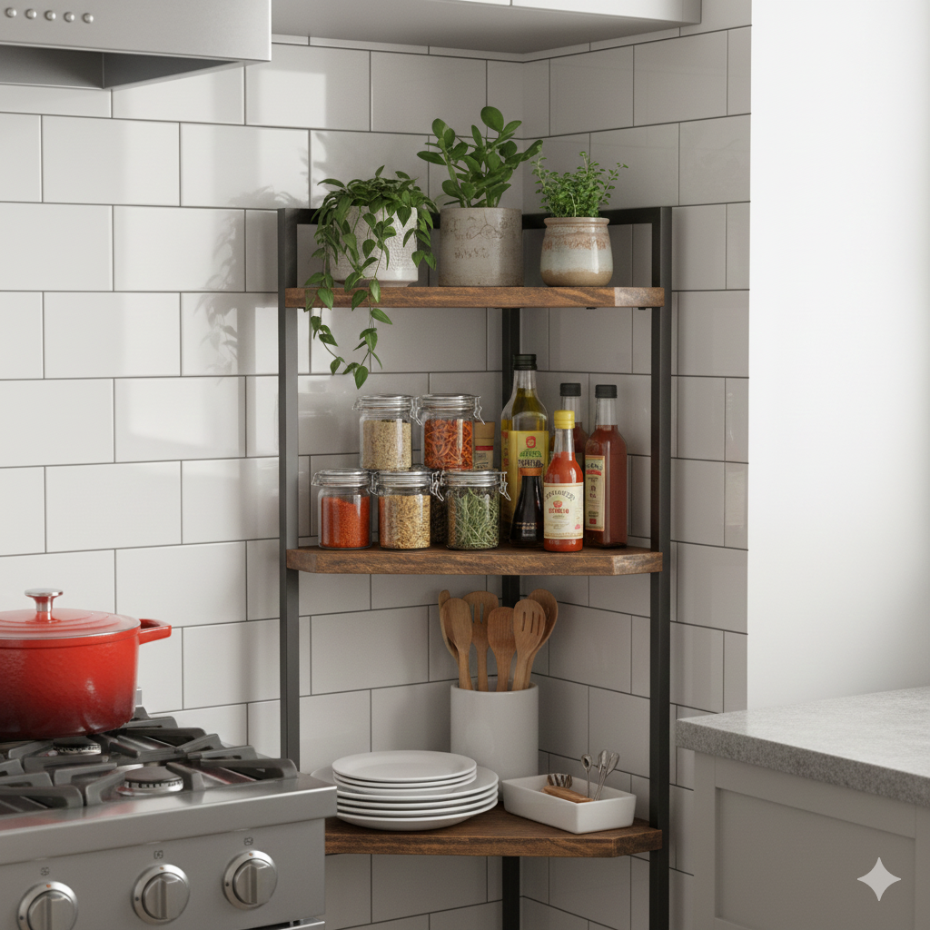 Area sudut adalah “harta karun ruang” yang banyak dilupakan. Rak sudut modern dapat memberikan fungsi optimal, terutama untuk dapur kecil.