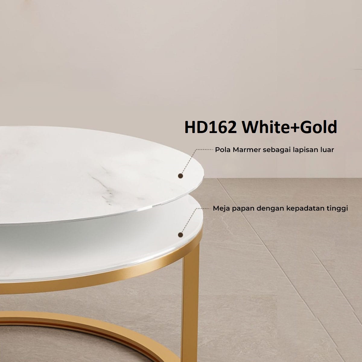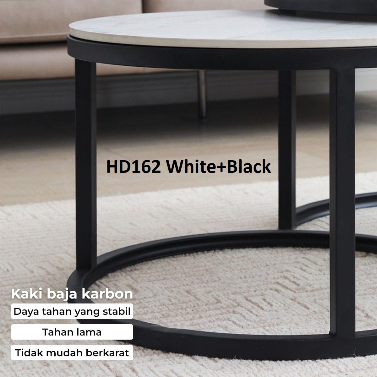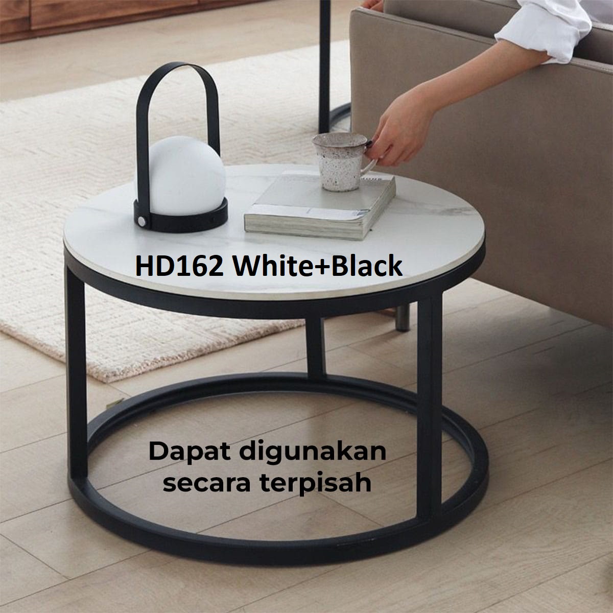 Set meja bundar HD162 terdiri dari dua ukuran yang dapat digunakan bersama sebagai satu set atau dipisah di dua lokasi berbeda, sangat fleksibel untuk ruang tamu, ruang keluarga, kamar tidur, ruang kerja, hingga area resepsionis kantor.